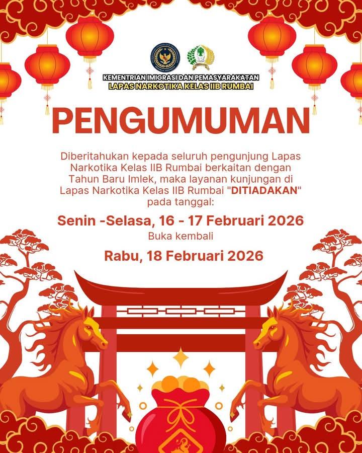 PEKANBARU — Diberitahukan kepada seluruh pengunjung Lapas Narkotika Kelas IIB Rumbai berkaitan dengan Tahun Baru Imlek, maka layanan kunjungan di Lapas Narkotika Kelas IIB Rumbai “DITIADAKAN” pada tanggal: