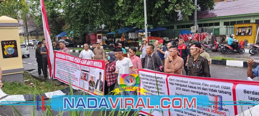 Pekanbaru, RIAU — Puluhan Jurnalis di Pekanbaru yang tergabung dalam Aktivis Pers-LSM menggelar aksi unjuk rasa di Mapolda Riau, Jum’at (08/08/2025) sore.