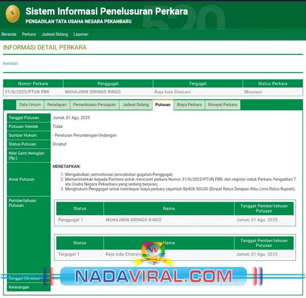 Hal ini diketahui setelah Putusan penetapannya dibacakan oleh Majelis Hakim pada tanggal 01 Agustus 2025, melalui Ecourt Pengadilan Tata Usaha Negara (PTUN) Pekanbaru dengan penetapannya No 31/G/2025/PTUN PBR, dengan tergugat Raja Izda Charani, Kepsek SMP Negeri 1 Pekanbaru.