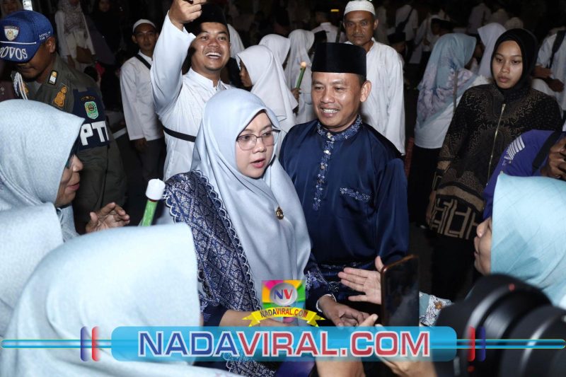 Bupati Siak Afni usai melepas pawai obor dan mobil hias menyempatkan diri bercengkrama bersama peserta pawai dan juga masyarakat sekitar yang antusias melihat lomba pawai takbir dan juga mobil hias.