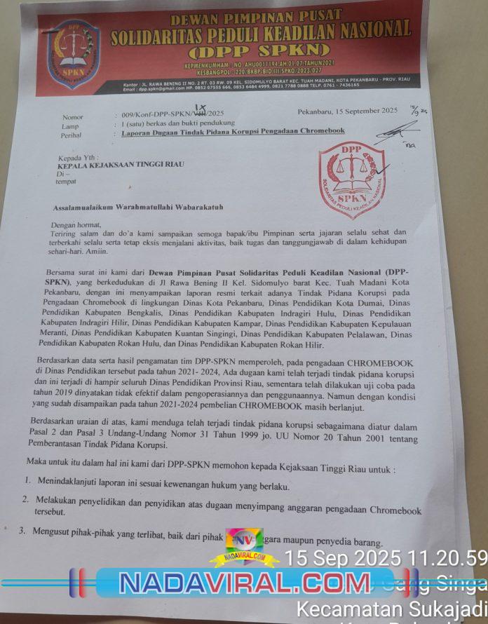 PEKANBARU, (NVC) — Usai penetapan mantan Menteri Nadiem Makarim oleh Kejaksaan Agung RI, kini Pegiat anti rasuah dari Dewan Pimpinan Pusat, Solidaritas Peduli Keadilan Nasional (DPP-SPKN) melaporkan dugaan Tindak Pidana Korupsi (TPK) pada pelaksanaan proyek Pengadaan Perangkat Teknologi Informasi dan Komunikasi (TIK) di 11 Dinas Pendidikan Kabupaten/Kota di Provinsi Riau tahun 2021- 2024 ke Kejaksaan Tinggi (Kejati) Riau.