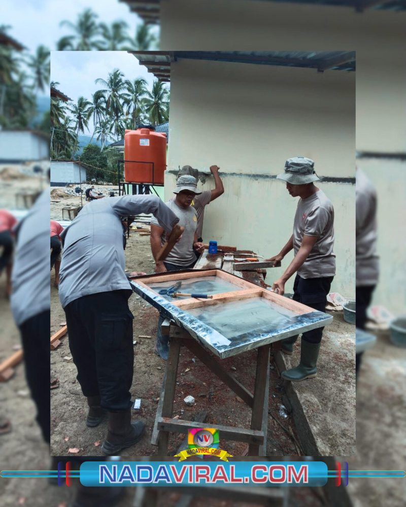 Tapanuli Selatan — Personel Brimob Batalyon C Polda Sumatera Utara bersama masyarakat setempat melaksanakan pembangunan fasilitas mandi, cuci, kakus (MCK) bagi warga terdampak banjir di Desa Tolang Julu, Kecamatan Sayur Matinggi, Kabupaten Tapanuli Selatan, Jumat (09/01/2026).