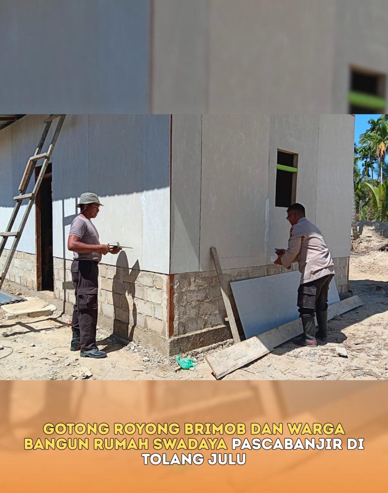 Tapanuli Selatan — Personel Batalyon C Satuan Brimob Polda Sumatera Utara bersama masyarakat setempat melaksanakan pembangunan rumah swadaya bagi warga terdampak banjir di Desa Tolang Julu, Kecamatan Sayur Matinggi, Kabupaten Tapanuli Selatan, Minggu (18/1/2026).