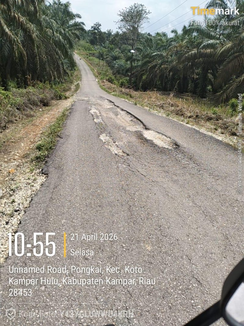 KAMPAR — Kondisi sejumlah ruas jalan rusak di Desa Pongkai, Kecamatan Koto Kampar Hulu, Kabupaten Kampar, Provinsi Riau, kembali menuai sorotan. Kerusakan jalan yang berlangsung selama bertahun-tahun itu semakin parah dan berdampak terhadap aktivitas masyarakat yang melintas setiap harinya.