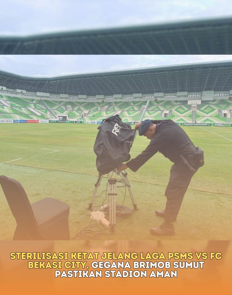 Deli Serdang — Dalam rangka memastikan keamanan dan kenyamanan seluruh pihak pada pertandingan sepak bola PSMS Medan melawan FC Bekasi City, Tim Penjinak Bom (Jibom) KBR Detasemen Gegana Satuan Brimob Polda Sumatera Utara melaksanakan sterilisasi menyeluruh di Stadion Utama Sumatera Utara, Batangkuis, Kabupaten Deli Serdang.